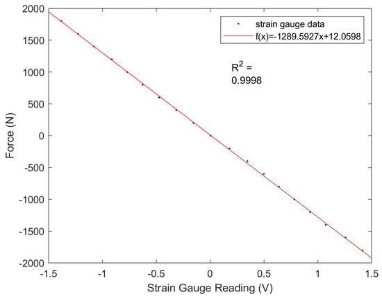 During the test, the sensors were subjected to both tension and compression in 200 N increments, culminating at a maximum force of 2000 N. The sensor data were captured by a control board (FlexSEA-Rigid, Dephy Inc., Boxborough, MA, USA), equipped with a cascaded RC low-pass filter (1.6 kHz cutoff) and a dual-stage instrumentation amplifier with high common-mode rejection ratio (CMRR) and a gain of 202.6. Figure 7 presents the test results and curve fitting, indicating a near-linear correlation between the applied external forces and the sensor readings.