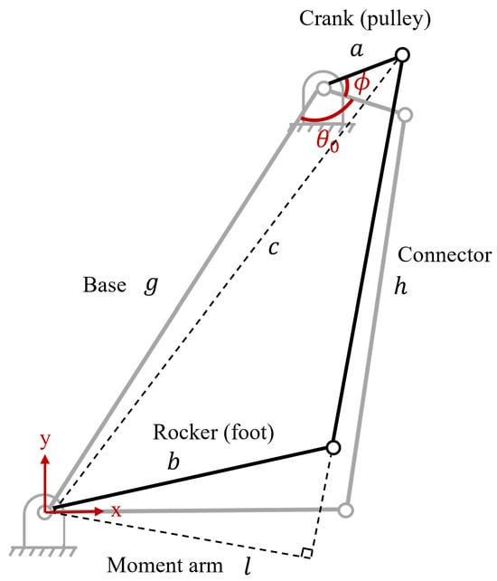 For the sagittal plane, the moment arm is a function of the crank angle in the four-bar linkage. In Figure 8, represents the crank angle when the rocker (foot) is at the zero position (101.73°), and represents the angle relative to that zero position. To find the moment arm l, first calculate c using the law of cosines: