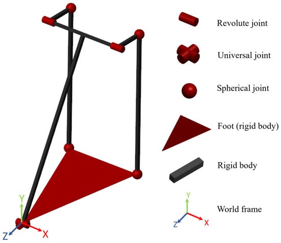 A kinematics model of the ankle was constructed in a virtual environment using MATLAB/Simulink Simscape Multibody (MathWorks Inc., Natick, MA, USA), as illustrated in Figure 9. The model simulates an RR-2RSS mechanism, where R represents a revolute joint, and S represents a spherical joint. A universal joint is formed by two revolute joints with mutually orthogonal axes and coincident origins. The world frame is a motionless, orthogonal, right-handed frame and serves as the ground of all the frame networks in the model. The spherical joints model the swivel bearings in the ankle, which have a 27° range of motion on the z-axis (hence a 13.5° inversion/eversion).