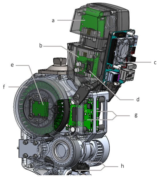 Overall electronics system: (a) battery module, (b) power distribution board, (c) ORDROID-XU4 single-board computer, (d) emergency stop connector, (e) absolute encoder, (f) motor, (g) FlexSEA-rigid, and (h) strain gauges.