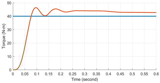 In the step response tests, each motor drive was tested individually to verify comparable performance. A torque of 40 N·m was set as the target. The results for one actuator, depicted in Figure 14, showed a 10–90% rise time of 0.040 s and an overshoot of 16%. The other actuator exhibited a similar performance, with a rise time of 0.035 s and an overshoot of 18%, ensuring consistent functionality across both actuators.