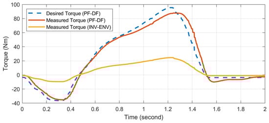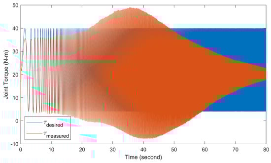 Figure 15 displays the time domain results for the torque controller bandwidth tests. The desired torque command () and the measured torque output () of the actuator are plotted. For these tests, a chirp torque command sweeping from 0.1 to 40 Hz over 80 s was input to comprehensively evaluate the torque tracking performance across frequencies.