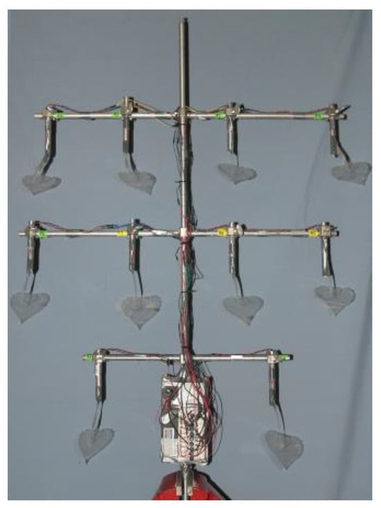 McCloskey et al., in their study [59], focused on the potential of using plant-inspired designs to convert wind energy. The goal of their study was to explore alternative methods to traditional wind turbines to overcome their limitations, such as noise, visual impact, and restricted deployment in residential areas. They investigated the use of artificial plants containing piezoelectric elements, which can generate electrical energy from wind-induced vibrations (Figure 3).