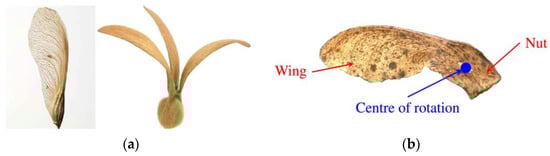 (a) Maple seed (left) and Triplaris samara seed (right). (b) Two main parts of a maple samara [74,75]. Reprinted with permission from [75], Copyright ©, 2024, Elsevier.