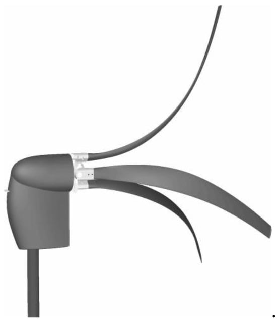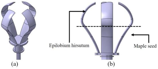 Herrera et al. investigated the structural design and manufacturing process of a low-scale bio-inspired wind turbine blade based on the Triplaris americana tree seed [79]. The blade design was derived from an analysis of the seed’s curvature and airfoil along its wingspan, resulting in a nonconventional HAWT with three blades (Figure 6).