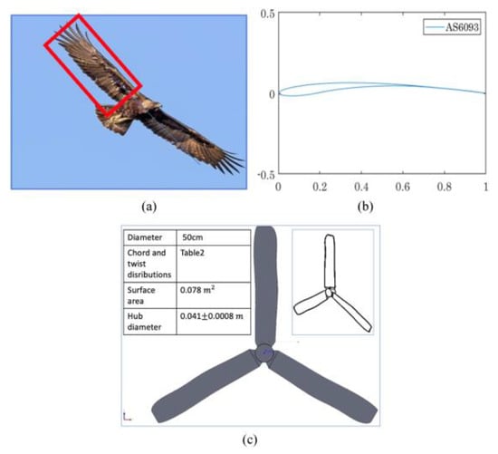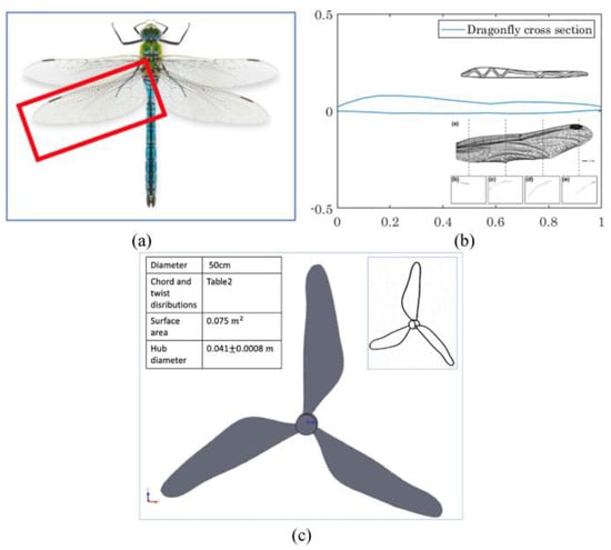 Dragonfly inspired blade design geometric characteristics [96]: (a) geometry of wing as found in nature, (b) airfoil profile, and (c) bio-inspired designed turbine [96]. Reprinted with permission from [96]. Copyright © 2024, Elsevier.