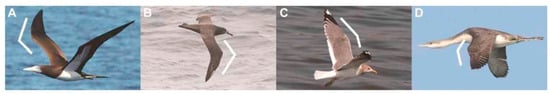 - Lentink, D.; Müller, U.K.; Stamhuis, E.J.; de Kat, R.; van Gestel, W.; Veldhuis, L.L.M.; Henningsson, P.; Hedenström, A.; Videler, J.J.; van Leeuwen, J.L. How Swifts Control Their Glide Performance with Morphing Wings. Nature 2007, 446, 1082–1085. [Google Scholar] [CrossRef] [PubMed]