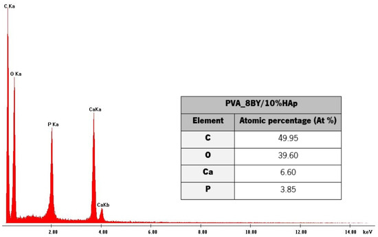 EDS spectrum determined on the PVA_8BY/10%HAp composite surface, with their chemical composition.