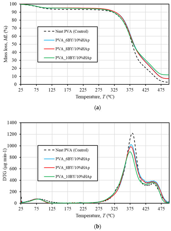 TGA was used to examine the thermal decomposition (phase transitions) over time as a function of temperature to determine the thermal stability of neat PVA-braided systems (i.e., the control group) as well as the corresponding composites (the experimental group). The TGA and DTG thermograms of both pure PVA braids and PVA/10%HAp composite braiding are illustrated in Figure 4. The control group is represented by a single curve due to the high degree of similarity in behavior among the control architectures (neat-PVA_6BY, 8BY, and 10BY). The curve depicted in Figure 4a illustrates the weight loss (in percentage), denoted as ML (also in percentage), in relation to temperature T (between 25 and 500 °C). As depicted in Figure 4b, the DTG curve indicates the initial derivative of the TG over the same temperature interval.