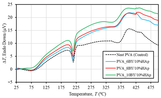 The DTA curves for pure PVA braids (control group) and PVA/10%HAp composite braids (experimental group) are depicted in Figure 5. In line with TGA/DTG analyses, the performance of the three control architectures (PVA_6BY, 8BY, and 10BY) demonstrated remarkable comparability. Consequently, a single curve is utilized to portray the control group. Furthermore, Table 2 provides an overview of the average thermal properties of the fibrous structures examined in this study, enabling a clearer differentiation and highlighting the impact of the incorporation of HAp on the thermal characteristics of PVA strands.