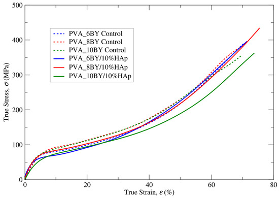 True tensile stress–strain mean curves for both neat PVA (control) and PVA/10%HAp braided architectures exhibit distinct characteristics, considering ten independent results per curve.