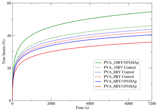 The investigation involved conducting creep tensile experiments on two groups: the experimental group consisting of PVA_6BY/10%HAp, PVA_8BY/10%HAp, and PVA_10BY, and the control group consisting of neat PVA_6BY, PVA_8BY, and PVA_10BY. To ensure a uniform and abrupt increase in tensile stress, a fixed load was utilized. Consequently, for a period of 7200 s, input stress values () of approximately 48.44 MPa, 49.65 MPa, 45.65 MPa, 48.60 MPa, 51.03 MPa, and 43 MPa (equivalent to 12% of the respective tensile strengths) were applied to the following materials: neat PVA_6BY, neat PVA_8BY, neat PVA_10BY, PVA_6BY/10%HAp, PVA_8BY/10%HAp, and PVA_10BY/10%HAp, respectively. Due to its significantly lower value compared to the ultimate tensile stress () reached by the material under monotonic uniaxial tensile loading, ensures a linear response throughout the entire loading procedure. In Figure 8, the mean creep curves of neat PVA braids and the corresponding PVA/10%HAp composites are shown. Additionally, Table 4 provides the mean true strain function for the stress input within a period of 7200 s. The figure uses mean creep curves from ten valid results (recovery from creep was not plotted).