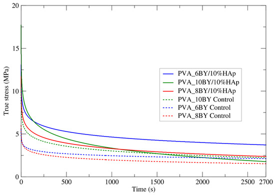 Tensile loading relaxation tests were conducted on the equipment and braided configurations (6BY, 8BY, and 10BY) that were mentioned earlier. A piece-wise function with magnitude ε0 was considered for the same period (2700 s), with the frequency of acquisition set to 5 Hz (tolerance: ±1%). The value of ε0 was set equal to the one that had been obtained when stress reached the threshold of 12% of the σu (true value) in the linear elastic regime for the control group (neat-PVA_6BY, neat-PVA_8BY, and neat-PVA_10BY) and experimental group (PVA_6BY/10%HAp, PVA_8BY/10%HAp, and PVA_10BY/10%HAp), respectively. Ten specimens were also evaluated for braided configuration.