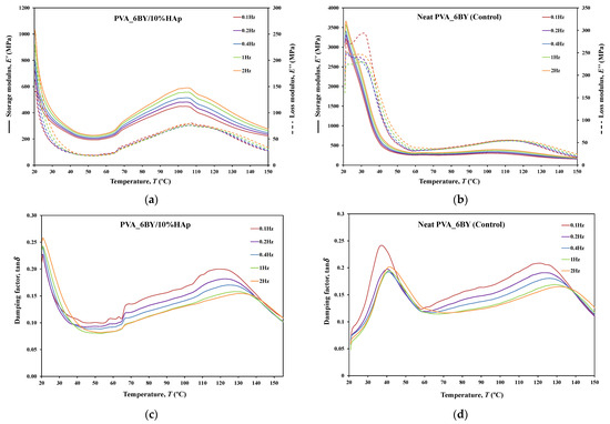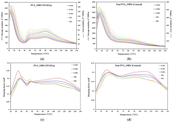 Tensile multi-frequency spectra of PVA_10BY/10%HAp and neat-PVA_10BY: (a,b) storage and loss moduli; (c,d) loss tangent.