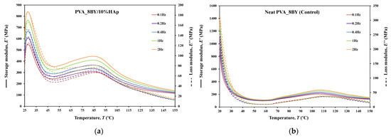 Certainly, this event is characterized by a significant decrease in [62] (i.e., a reduction in stiffness, as in [23]), but it is predominantly denoted by a peak in , as it showcases the material’s capability to dissipate mechanical energy (i.e., it is linked to plastic response) [29,63,64]. The of a polymer plays a crucial role in comprehending the material’s effects on mechanical behavior, the level of crosslinking, and the alterations that occur within the bulk at a specific temperature [65]. This material parameter is of utmost importance. The crystallinity of the PVA polymer chains is a determining factor [23]. Therefore, the second and significantly wider peak is related to the of PVA, an alpha transition () that characterizes the initial (primary) motion of the PVA main chain in the amorphous regions of the polymer matrix [45,66]. This means that values approximately equal to 107 °C, 89 °C, and 91 °C were identified for PVA_6BY/10%HAp, PVA_8BY/10%HAp, and PVA_10BY/10%HAp, respectively, being slightly different from those obtained in DTA. An increase in the values of composite systems (experimental group) was observed when compared to the corresponding neat PVA architectures (control group), except for the 8BY case, upon the incorporation of HAp. Similar outcomes were observed when HAp was incorporated into the polymeric matrix in a separate investigation [45]. A slight increase in the was observed, starting at 32 °C (representing pure PLGA) and reaching a maximum of 37 °C as the nano-HAp concentration increased from 0% to 10% (hindering the movement of the polymer chain) and then reaching a plateau. This phenomenon can be attributed to the strong interactions formed between PVA and HAp, which involve hydrogen bonding and [OH-]–Ca2+-[-OH] linkages. These interactions impose further constraints on the polymer chains, thereby limiting their segmental mobility [22,49]. The formation of such robust interactions could potentially result in unforeseeable fluctuations in the characteristics of the biomaterial [33]. Referring to the loss tangent (tanδ), it was observed that it continues to decrease at higher temperatures, up to 160 °C. However, the obtained response tends to converge to a frequency-independent value that is distinct, suggesting that the molecular orientation of the composite systems is increasing as a result of polymer stretching.