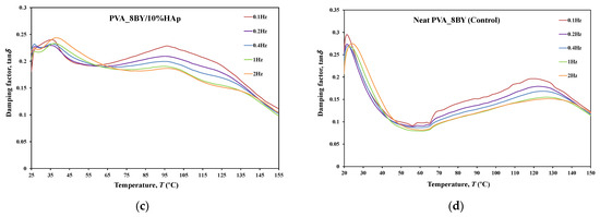 As shown in Figure 10, Figure 11 and Figure 12c,d, the highest tanδ peak for neat PVA-braided fabrics occurs at 0.1 Hz, which corresponds to low damping or a high . Moreover, in the absence of the 10BY system, the addition of HAp diminishes the peak intensity at the identical frequency value (0.1 Hz), indicating a greater decrease in damping or increase in . The addition of HAp to neat PVA brains results in a decrease in their viscoelastic behavior, which subsequently shifts to an elastic response. The observation of this occurrence validates the brittleness of PVA/10%HAp composite braided in comparison to pure PVA structures [29], as the addition of HAp modifies the viscoelastic characteristics of the polymeric material. This is because the imposed restrictions on the mobility of the polymer chains reduce the damping (tanδ) [29] of braided composites consisting of PVA/10%HAp.