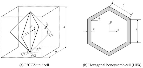 Considering the load in a 3-point bending scenario, the core is responsible for transferring the shear stresses and the transverse normal stresses resulting from the localized load. Thus, the selected core material should meet these requirements to withstand the resulting stresses in the core. This study focuses on 3D strut-based lattice structures and regular honeycombs. Souza et al. [37] provided an analytical model based on beam theory to analyze the mechanical performance of numerous strut-based lattice topologies. Based on this model, face-centered lattice cells with vertical struts (F2CCZ) show the highest shear and transverse strength compared to other strut-based lattice materials. Furthermore, this model will be used to obtain the effective properties of the lattice material. Figure 1a illustrates the cubic lattice unit cell of the F2CCZ representative volume element. The cell of size a consists of nine struts: four inclined struts in the -plane, four inclined struts in the -plane, and one vertical strut. A uniform diameter d is present in all struts. An experimental study performed by Sereshk et al. [38] proved that the mechanical response of the lattice depends merely on the unit cell’s aspect ratio . Thus, the effective stiffness of the lattice changes when the cell size a remains constant and the strut diameter d varies. Figure 1b shows the regular hexagonal honeycomb cell (HEX). The unit cell’s height and length are assumed to be identical and described by the quantity l. According to Gibson and Ashby [39], the in-plane and out-of-plane stiffness of the regular honeycomb can be given as