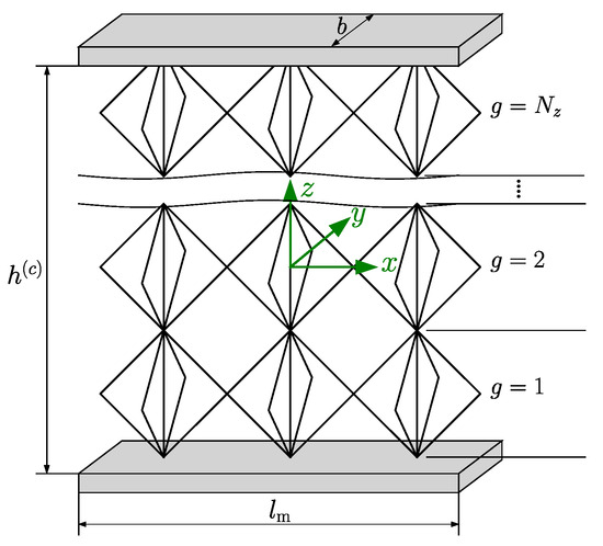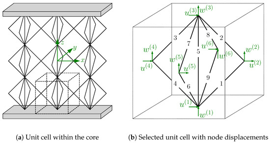 Although the core is homogenized, the displacements at the lattice node coordinates are obtained by Equation (36), where m is the node’s number in the unit cell, as illustrated in Figure 6b. These displacements are required to determine the lattice struts’ stresses. First, the change in length in each of the struts can be calculated by