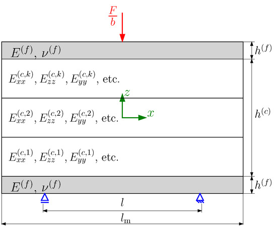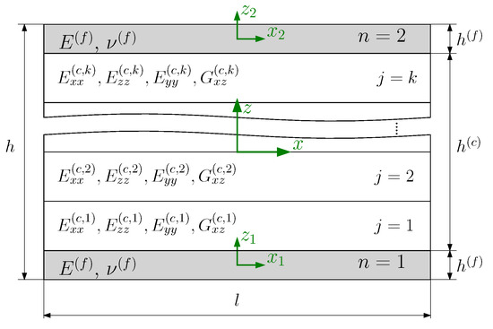 Following the assumption of a plane-strain state and isotropic face sheets, the stresses within the face sheet layers can be expressed as follows