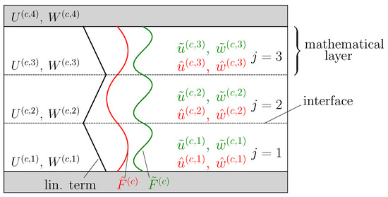 The distribution functions , , , and have to respect the displacement continuity conditions at the layer interfaces, ensuring the prevention of displacement discontinuities. Therefore, the functions and vanish at the interfaces. The expressions for these functions are provided as follows