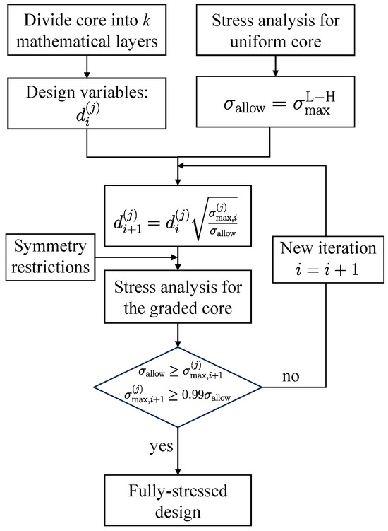 Fully stressed design (FSD) is a size optimization method that belongs to the so-called heuristic methods. Its criterion is based on reducing the thickness of the lattice struts so that the struts are fully stressed under the given loading conditions. This means that material is removed from those members of the lattice that are not fully loaded, unless a minimum thickness limits them. As a heuristic method, it cannot always guarantee the optimum solution, but it provides a sufficient approximation in many cases. Hence, it is practical and effective. Furthermore, FSD is typically one of the most straightforward but efficient ways to optimize these truss structures [42]. The computational cost is less than the cost of using more complex optimization methods to ensure an optimal solution [43]. Figure 7 shows the FSD scheme used in this study, which can be summarized in the following steps: