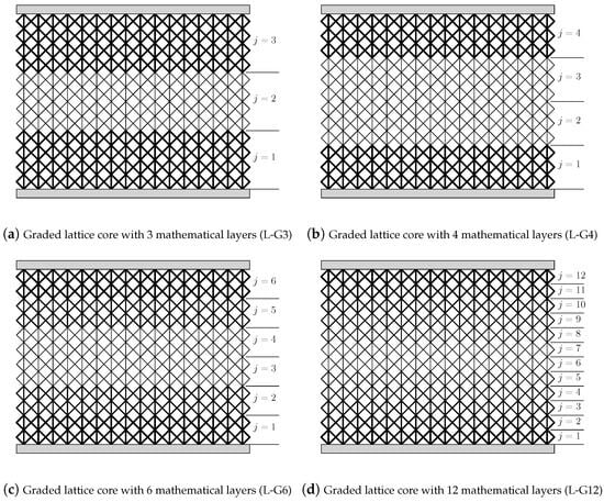 The core will be partitioned into k mathematical layers to facilitate grading through the core thickness (Figure 3). Each mathematical layer may include several uniform strut diameter lattice layers. As a result, the number of lattice layers may deviate from the number of mathematical core layers, depending on the grading approach. Thus, the total number of lattice physical layers is not necessarily identical to that of the mathematical layers k. This modeling enables grading the core with low computational effort. The mathematical layer is assigned an effective stiffness corresponding to the aspect ratio () of the representative volume element (RVE). The quantity j signifies the number of the core’s mathematical layer through the thickness, and c indicates the core of the sandwich model. For the homogeneous core, the core will be represented by a single mathematical layer.