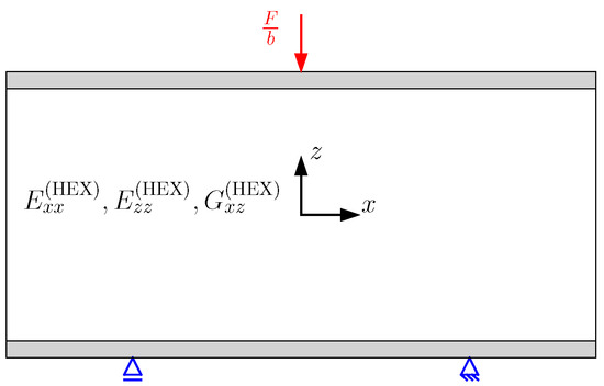 To verify the results determined by the analytical model, finite element analysis (FEA) is performed for the sandwich with the homogeneous lattice core, the honeycomb core, and the final version of each fully stressed graded core design. The FEA conducted in ABAQUS CAE Software uses 3D solid elements to model the face sheets and Timoshenko beam elements for the lattice struts. The struts are bonded with the face sheets using tie constraints. The mesh size is . The core consists of one unit cell in the y-direction (). To match the plane-strain state assumption, the displacements in y-direction are suppressed in the finite element model [47]. The load is applied as a line load on the upper face sheet. An exemplary finite element model is shown in Figure 9. In the FE model of the sandwich with the honeycomb core, the core is modeled as a contiuum core since the effective properties represent the honeycomb structure. Thus, a 2D FE-model using plane-strain continuum elements with the corresponding boundary conditions is created, as shown in Figure 10. The load in the 2D model is applied as a concentrated load.