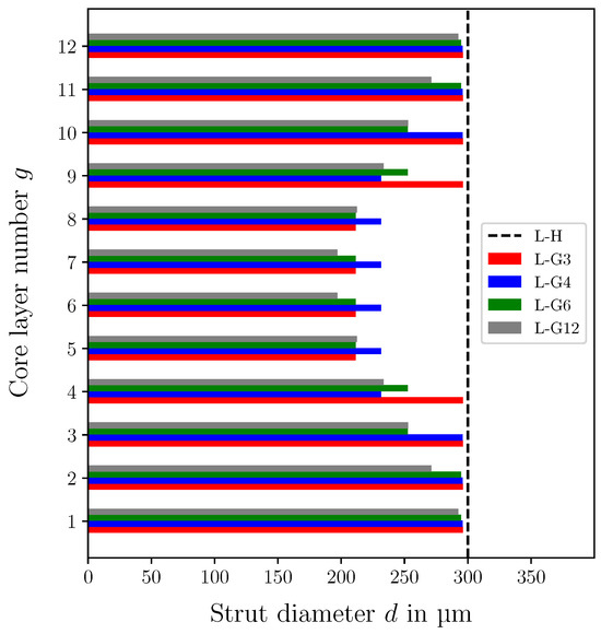 Strut diameters of the 12 core physical layers in the graded lattice cores determined by the fully stressed design and the uniform lattice core. (L-H): lattice core with unifrom strut diameter, (L-G3): graded lattice core with 3 mathematical layers, (L-G4): graded lattice core with 4 mathematical layers, (L-G6): graded lattice core with 6 mathematical layers, (L-G12): graded lattice core with 12 mathematical layers.