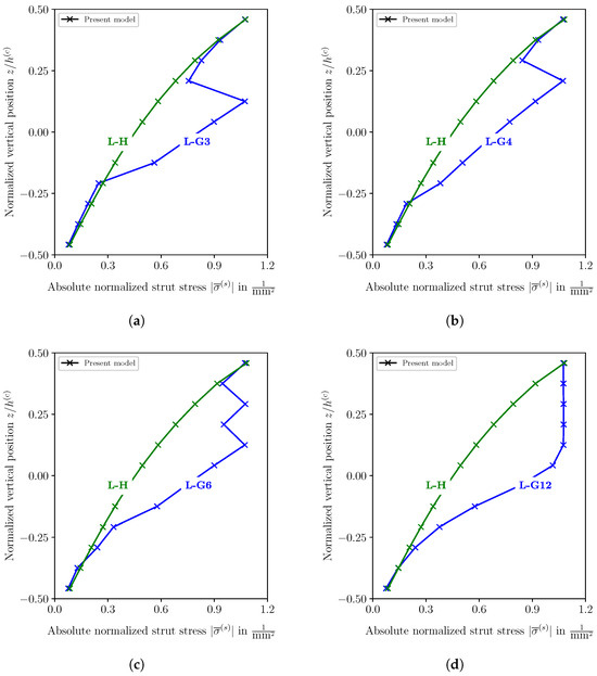 Absolute stress in vertical struts of the lattice core through the core thickness at the center of the sandwich () for several graded cores and homogeneous cores. (a) Homogeneous lattice core (L-H) and graded lattice core with 3 mathematical layers (L-G3), (b) homogeneous lattice core (L-H) and graded lattice core with 4 mathematical layers (L-G4), (c) homogeneous lattice core (L-H) and graded lattice core with 6 mathematical layers (L-G6), (d) homogeneous lattice core (L-H) and graded lattice core with 12 mathematical layers (L-G12).