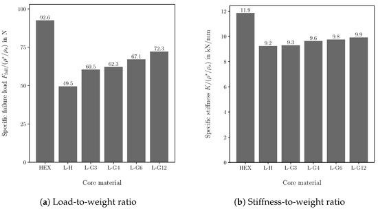 For the performance comparison, the von Mises strength criterion and Euler buckling criterion are used to evaluate the strength and stability of the lattice cores. The failure load is divided by the core’s relative density to evaluate the sandwich structure’s load-to-weight ratio. Figure 13a illustrates the comparison of the specific failure load for the different core materials. By varying the strut diameter, the failure load of the graded cores increases up to 46% compared to the homogeneous lattice core. The load-to-weight ratio increases mainly as the number of design variables defined in the fully loaded design increases. Thus, the L-G12 design provides the highest increase in specific load capacity, and the L-G3 design provides the lowest increase, which is only approx. 22% compared to the homogeneous lattice core (L-H). However, the honeycomb core outperforms all lattice cores. The load-to-weight ratio of the honeycomb core is up to 28% higher than that of the lattice core with the highest specific failure load (L-G12). Thus, it has been demonstrated that grading the core may significantly improve the mechanical performance of the sandwich panel. In addition to the load-to-weight ratio, the stiffness-to-weight ratio is used to assess the specific stiffness of the sandwich panel. The slope of the force–displacement curve K is used to determine the stiffness-to-weight ratio. The displacement is evaluated at the middle of the bottom face sheet. Again, the sandwich with the honeycomb core shows an at least 19% higher specific stiffness than the lattice core designs, as shown in Figure 13b. Although the deflection of the sandwich increases due to the core grading, the specific stiffness increases since the core weight decreases. The increase in the specific stiffness due to the core grading is up to 7% compared to the homogeneous lattice core. As the graded design was stress driven, the increase in the specific failure load is higher than the increase in the specific stiffness. The outcomes of comparing honeycomb core and the uniform lattice core match with the experimental results for sandwich panels with lattice and honeycomb cores presented by Monteiro et al. [48].