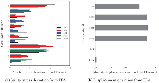 It is worth noting that the stiffness of the sandwich depends on its length-to-thickness ratio. Neglecting the core indentation and assuming a high axial stiffness of the face sheets compared to the core stiffness, the total deflection of the sandwich consists of two components [49]. The first component is induced by the resulting bending moment, and it depends mainly on the stiffness of the face sheets ( with the face sheets’ second moment of inertia with respect to the center of gravity of the sandwich). The second component results from the shear load and decreases with increasing shear stiffness ( with A the effective shear area of the sandwich). It can be recognized that in thinner sandwich panels, the bending component will be the dominant term in the total deflection, and a decrease in the core’s shear stiffness will not significantly increase the total deflection of the sandwich. If the length is tripled, the bending component would increase by a factor of 27, while the shear component would merely triple. Therefore, the stiffness of the sandwich is affected by the sandwich’s length. However, the strength of the core is independent of the length, as we observed in previous studies [50]. To verify the results determined by the derived model, the deviation from the results obtained by the finite element model is determined. Figure 14 shows the deviation of the calculated stresses and deflections from the FEA solution. Since the analytical model uses a displacement-based approach, the deflections are rather accurately determined by the derived model, particularly for the homogeneous lattice and honeycomb core. Compared to the deflection results, the prediction of the struts’ stresses is less precise, but it remains reasonable. The deviation for calculating the honeycomb core’s critical stress is merely 2.67%. While the FEA requires approx. five minutes to calculate the struts’ stresses, the model presented provides the results in less than one minute for the uniform core.