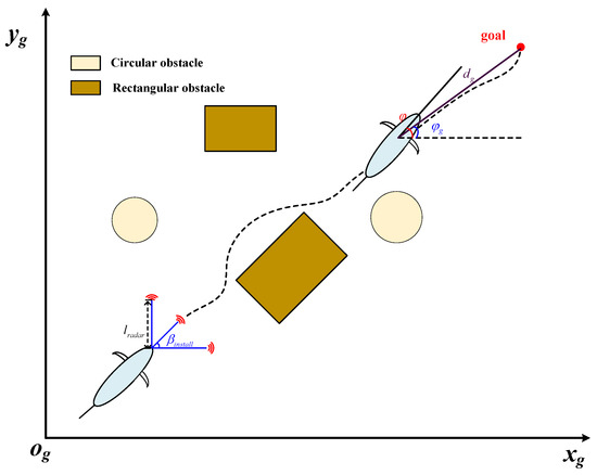 Furthermore, Figure 2 illustrates a schematic diagram of an underwater autonomous exploration task. The biomimetic robotic fish departs from the starting point and moves toward the target point. indicates the current yaw angle. represents the angle between the current heading and the target heading. denotes the distance to the target point. Regarding obstacle measurements, the measuring distance of the three ranging sensors is set to , which is smaller than the maximum underwater measurement distance of the utilized sensing devices. Additionally, the installation angles for the left and right ranging sensors are denoted as . Regarding obstacles, two obstacle types are designed in this paper: rectangular obstacles and circular obstacles. Both types of obstacles can be set at random positions and sizes. Hence, overlapping is permitted to form underwater obstacles of any shape.