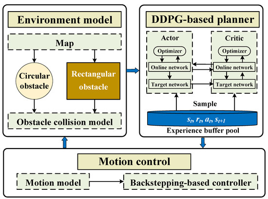 Based on the aforementioned problem description, this paper proposes an autonomous intelligent exploration framework for biomimetic robotic fish, taking obstacle avoidance into account, as shown in Figure 3. Firstly, the underwater environment is modeled. Adopting a sensor design scheme based on biomimetic robotic fish, two types of obstacles, rectangular and circular, are designed, further establishing the obstacle models and collision models. This enables real-time interaction between the biomimetic robotic fish and environmental information. Secondly, using the DDPG method, a neural network based on multi-layer perceptron (MLP) is constructed to achieve intelligent and safe underwater motion planning. Considering the characteristics of the task, the state space, action space, and reward function are designed, and the performances of different training setups are investigated. Thirdly, based on the obtained motion planning, a heading motion control method based on the backstepping approach is provided. Specifically, to address sudden changes in planning quantities, we adopt a smooth transition method based on a smooth step function to enhance tracking stability. In this process, due to the higher real-time requirements of yaw control compared to motion planning, different time periods are applied to the planning layer and control layer.