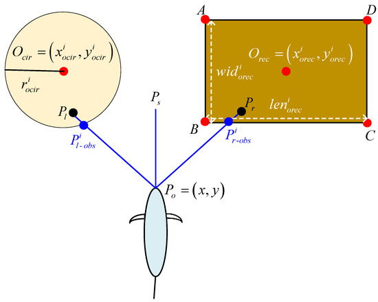 Next, a brief description of the modeling process for rectangular obstacles is presented. In Figure 4, the center point of rectangular obstacle i is denoted as , with the length and width represented by and , respectively. Consequently, the coordinates of the four corners of rectangular obstacle i can be derived as follows: