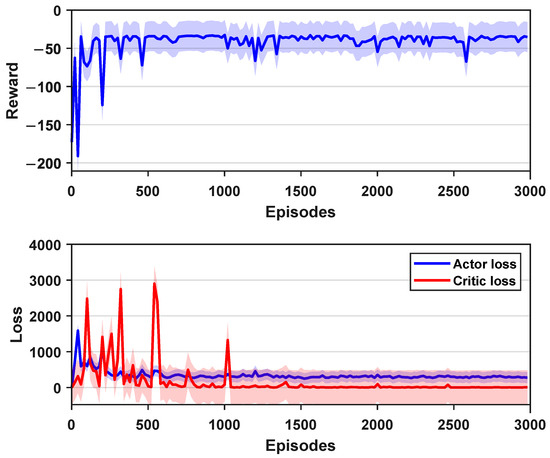 Figure 5 presents the training results under a fixed obstacle configuration, including a reward and two types of losses. The shaded region in the figure represents the standard error of the data annotated based on the training results. The results indicate that the proposed deep reinforcement learning planning method achieved rapid convergence. Although there is some instability in the first 500 steps, the subsequent curves demonstrate relatively stable performance.