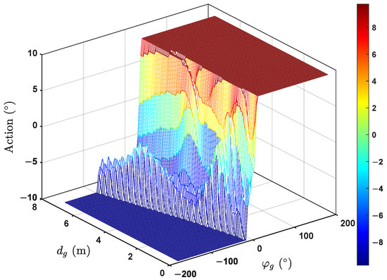 Furthermore, we investigated the relationship between the partial state variables and output actions. Taking and as examples, Figure 6 indicates the mapping relationship between them. Since the forward velocity was set to a fixed value and the lateral velocity was neglected, theoretically, there was a stronger correlation between the output actions and yaw angle. The training results demonstrate that in terms of the overall trend, the output actions generally changed with the variation of the yaw angles. Additionally, also played a role in some aspects. For instance, when was relatively large under the same yaw angle error, the output action tended to be more gradual. The main reason might be that when the distance to the target point was considerable, the learned strategy not only pursued the target yaw direction but also considered the smoothness of the path.