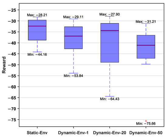 In addition, to thoroughly investigate the network’s performance under different training conditions, we conducted tests with different values of M. The specific definition of M is as follows. During the network training process, if the robotic fish successfully reaches the target point in each episode within the same obstacle environment, it is recorded as one success, and M represents the total number of successful attempts. Therefore, by fixing the obstacle environment and setting 1, 20, 50, four agents can be obtained. Subsequently, multiple tests were conducted for each training network. By employing the control variable method, we set up eight sets of identical obstacle environments for each agent, enabling the robotic fish to perform motion planning, and recording the cumulative reward. Figure 7 shows the corresponding results, illustrating the maximum and minimum rewards obtained by the four training environments in the eight test environments. Additionally, we also calculated the median, mean, and standard deviation for the four sets of data, as tabulated in Table 2. From the perspectives of the median, minimum, mean, and standard deviation, the network performance obtained from training in a static obstacle environment was optimal. As the value of M increased, the performance gradually decreased, which was also validated from the viewpoints of the mean, standard deviation, and minimum values. The plus sign + in figure indicates that the value is automatically marked as an outlier due to the large difference from the median. The reasons for the above phenomenon are mainly twofold. Firstly, when changing the environment, the positions of the obstacles were randomly generated, leading to situations where obstacles were either too simple or complex in certain trials. Secondly, theoretically, the static obstacle environment, equivalent to , resulted in a relatively unique optimal solution in that environment, facilitating the learning of the optimal strategy. Certainly, due to the total episode number being set at 3000, with a maximum of 300 steps per episode, the limitation on sample quantity may also have influenced the results.