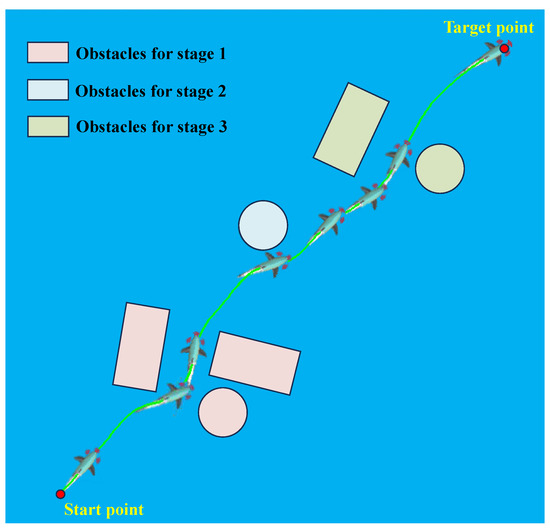 In this section, we select the network trained in a fixed obstacle environment for autonomous motion testing. Firstly, by randomly setting obstacle modeling data, a complex obstacle environment was generated. Secondly, the starting point (1.5, 1.5), the target point (6.5, 6.5), and the initial posture of 45° were defined. Subsequently, the DDPG-based planner and backstepping-based controller were applied. The results of the snapshot sequences are shown in Figure 8, indicating that the robotic fish successfully detected and correctly avoided each obstacle during the movement toward the target point. Figure 9 illustrates the real-time variation trends of the five state variables. Specifically, we divided the motion process shown in the figure into three stages based on obstacle avoidance behavior, represented by obstacles of different colors. In the first stage, the biomimetic robotic fish’s left and forward sensors detected obstacles, prompting a right turn based on network output. Since obstacles still existed on the right, the right and forward sensors received information, leading to a left turn. At this point, the robotic fish’s position was between two obstacles, with only the forward sensor having no data, yet the robotic fish chose to move straight ahead. The obstacle avoidance task in the second stage was relatively simple. When the left sensor detected an obstacle, a slight right turn led to successful avoidance. The third stage was similar to the first stage. However, the yaw angle error state variable in Figure 9 exhibited an approximately 5° steady-state error at the initial stage. The main reason might be the presence of a certain sudden change in control torque at the beginning of motion, leading to instability. In the later control stages, despite encountering multiple obstacles, the trained network continued to navigate toward the target.