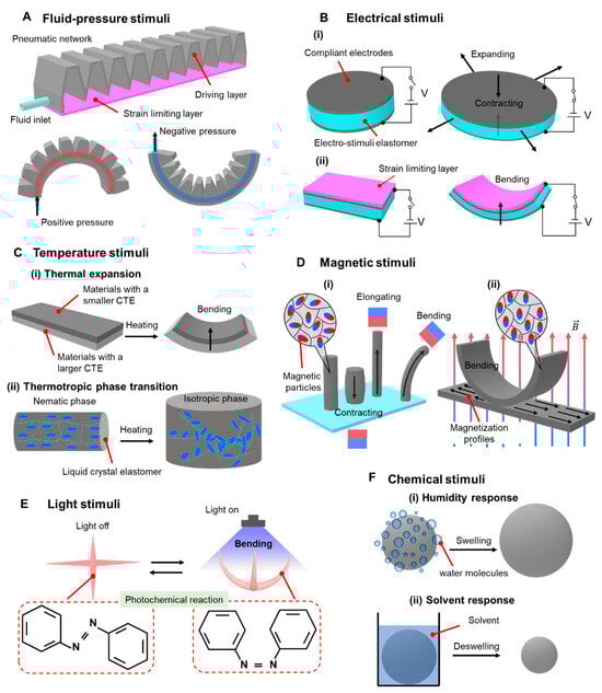 Stimuli-responsive principles of biomimetic soft actuators. (A) Pneumatic network actuators are actuated by positive-pressure or negative-pressure gas. (B–F) Actuation mechanisms triggered by external stimuli: electric fields (B), temperature (C), magnetic fields (D), light (E) and chemical stimuli (F).