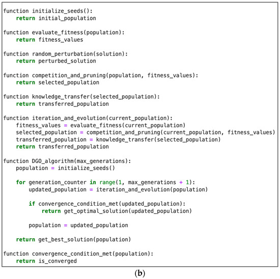 (a) Flowchart for the proposed DGO algorithm; (b) pseudocode for the proposed DGO algorithm.