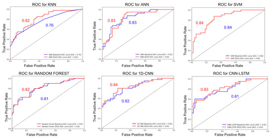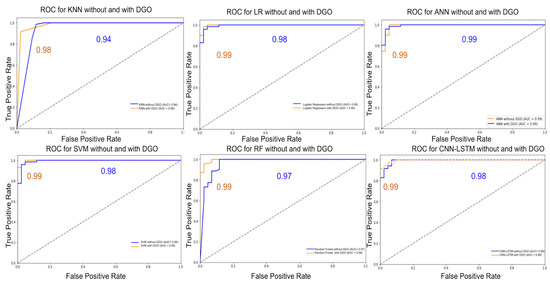 Figure 4 depicts ROC plots for some of the algorithms considered for the analysis with the DGO algorithm. It is observed that the plots with DGO are closer to the top left of the graph and have a higher score. This depicts that the algorithms when combined with DGO yield better performance.