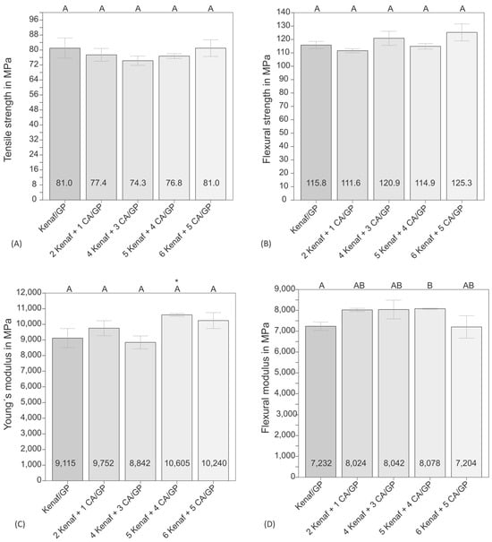 The flexural modulus results (Figure 2D) also show a larger scatter and range between 7200 and 8100 MPa. The composite made of kenaf with four layers of CA foils differs significantly from the reference sample made of kenaf. All other samples do not vary significantly. Since the characteristic value of the sample with four CA layers is very similar to the values of the sample with one CA layer and three CA layers, it is assumed that the difference is to be found in the very low standard deviation. The results of the flexural modulus are generally lower than those of the tensile modulus. This effect is described by Jaroschek [] and is justified by the different load applications during bending and tensile tests. It has been shown that the modulus of elasticity from the tensile test of polymeric materials is often approx. 5% higher than from the bending test []. A similar effect was also observed, e.g., for bio-based materials based on polyhydroxyalkanoates (PHA) [,]. Compared to results measured for 40 mass% kenaf-reinforced PLA resulting in a flexural modulus of 6900 MPa, the values of the presented kenaf/Greenpoxy composites are clearly higher [].