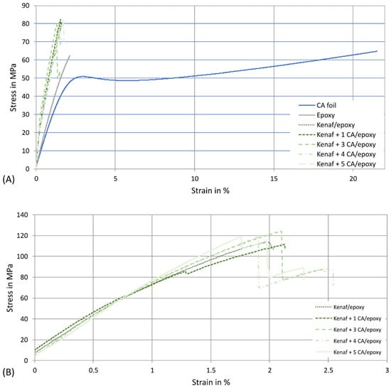 The results of the tensile and bending tests demonstrate that inserting CA foils between the multilayer fibre webs does not affect these composite properties significantly. The tensile strength (Figure 2A) could be increased for all materials to 74 to 81 MPa compared to the pure Greenpoxy matrix with a value of 61.0 ± 7.4 MPa. The presence of CA foils does not significantly affect the tensile strength. The strength of the CA foils was determined to be 64.9 ± 6.1 MPa and is, thus, in the same range as the value of the Greenpoxy matrix. If the rule of mixtures [] is applied, a comparable value would also be calculated for all materials since the material thickness is kept constant and the CA foils replace part of the matrix. Figure 3A shows the stress–strain curves of the tested materials. It can be seen that the kenaf-reinforced materials achieve lower strain values than the epoxy matrix. The CA foils achieve a similar maximum stress as the epoxy matrix but have a completely different stress–strain behaviour with a significantly higher elongation. This aspect significantly influences the toughness and will be discussed later. As the failure of the kenaf materials in the tensile test is essentially based on the weakest link theory [], the CA foils only lead to a slight increase in elongation at break compared to the kenaf material without CA foils. The tensile strength of the kenaf/Greenpoxy composites is clearly higher compared to 40 mass% kenaf-reinforced PLA composites with a tensile strength of 53 MPa determined in a previous study [] and in the same range of 40 mass% kenaf-reinforced PLA manufactured with improved compression moulding process parameters achieving a value of 82 MPa [].