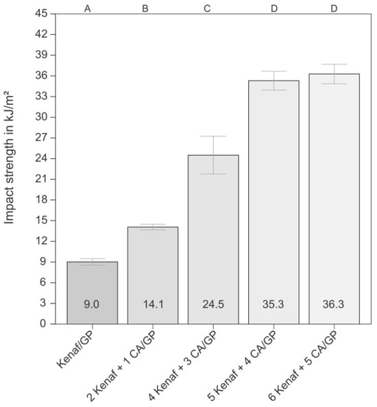 Unnotched Charpy impact strength of the kenaf composite and hybrid materials with different numbers of CA foil layers. The bars represent the median values, and the error bars represent the mean arithmetic deviation (MAD). All results are normally distributed; other letters represent significant differences.