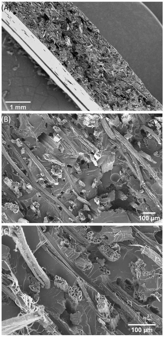 SEM micrographs of the fracture surfaces from the tensile test of a kenaf-reinforced composite. (A) overview, (B,C) detailed images.