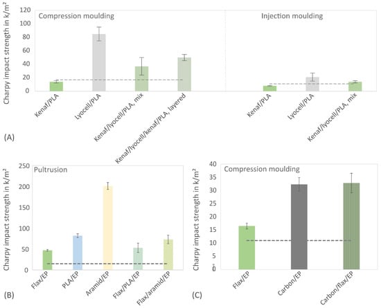 Unnotched Charpy impact strength (mean ± standard deviation) for different bast fibre-reinforced composites and hybrid materials. The dotted line represents the values of the pure matrix. (A) kenaf, lyocell and hybrid materials made of kenaf and lyocell produced in compression moulding and injection moulding process with a PLA matrix, (B) unidirectionally reinforced flax, PLA, aramid and hybrid materials with a bio-based epoxy matrix (Greenpoxy) produced using pultrusion process and (C) flax, carbon and hybrid materials made of fabrics in an epoxy matrix produced using compression moulding process.