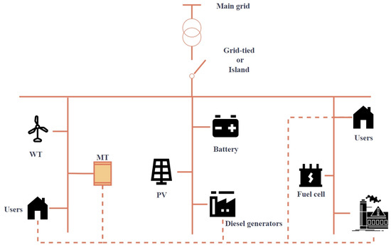 The optimal scheduling model of the microgrid is divided into multiple parts to supply power to the microgrid, including the operation of one or more micro turbines (MT), fuel cells (FC), diesel generators (DG), wind power (WT), photovoltaic (PV), and battery as shown in Figure 1. The microgrid has two operating modes, grid-connected operation and islanded operation. Grid-connected operation can purchase power from the main grid, while islanded operation is a relatively closed operation mode. This paper proposes a 24 h optimal dispatch model, in which distributed generating units are combined to generate electricity according to load demand [27]. The power generation process will generate operating costs and maintenance costs. In addition to wind power generation and photovoltaic power generation, harmful gases will also be produced which will cause environmental pollution, so there are also environmental costs. The research content of this article is to reduce the total cost as much as possible while satisfying the constraints. The cost formulas for various units are introduced below.