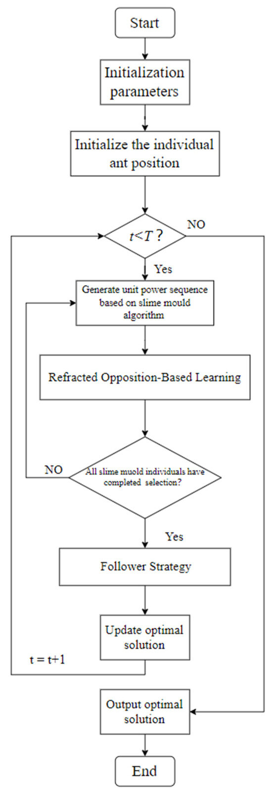 In recent years, meta-heuristic algorithms have rapidly advanced and solved many practical engineering problems [10]. These algorithms are advantageous in addressing single-objective, multi-objective, continuous, and discrete problems, ensuring high computational efficiency and accuracy when tackling complex challenges. They exhibit remarkable flexibility and applicability, effectively avoiding local optimal solutions compared to traditional mathematical methods and have been widely applied to various scientific problems [11]. As an essential branch of meta-heuristic algorithms, swarm intelligence algorithms are commonly employed in continuous and discrete problems within practical engineering contexts. Microgrid economic optimal dispatching has increasingly been addressed using swarm intelligence algorithms, as it is a typical high-dimensional, persistent optimization problem. Cui Z et al. solve mathematical problems using a hybrid cuckoo algorithm [12]. Microgrid dispatch considering cogeneration also uses a swarm intelligence algorithm [13]. The swarm intelligence algorithm to solve this problem has become mainstream according to the in-depth research on microgrid scheduling. Abhilipsa et al. [14] solved the problem of randomness in non-renewable energy and proposed a bidding strategy to optimize the profit function, but the constraints in the proposed model cannot be well integrated with the algorithm. Dai et al. [15] used simulated annealing algorithm and particle swarm algorithm for fusion, which enriched the diversity of individuals searched. However, the optimization algorithm proposed was highly random in search and not efficient. Cao et al. [16] studied microgrid dispatching strategies in two modes: grid-connected operation and networked operation. However, the paper did not intuitively display the power distribution diagram of each unit. Wang et al. [17] used a joint dispatch to solve the optimal dispatch problem of microgrids, but joint dispatch in multiple areas sacrifices the benefits of a single model, and the whale algorithm cannot balance this process well. Zhang Y et al. use the butterfly algorithm to optimize microgrids [18]. Wu, Zhi et al. [19] used particle swarm optimization to optimize the CHP microgrid system, which can meet the scheduling requirements, but the search accuracy of the particle swarm algorithm needs to be higher, and it cannot guarantee a good solution effect. Marzband, Mousa et al. [20] used the ant colony algorithm to optimize the scheduling of the microgrid. The experimental results show that the ant colony algorithm is worse than the particle swarm optimization algorithm for this problem. However, the performance of the ant colony algorithm could be better than the discrete problems in solving numerical problems. Yeh, Wei-Chang et al. [21] proposed a new concept involving the regeneration of a new feasible variable set and used a new genetic algorithm for optimization without penalty coefficients. The accuracy of the algorithm still needs to be improved. This paper proposed a novel algorithm to solve this practical application problem. After the slime mould algorithm was created, it was successively used in high-latitude, multi-objective numerical problems. Similarly, the microgrid model simulated in this paper is a complex numerical problem, and related SMA articles inspired us. The slime mould algorithm (SMA) is a novel swarm intelligence algorithm proposed by Li in 2020 [22]. Researchers observed that slime mould colonies stretch or expand their vein-like tubes during foraging to control the concentration of biomass flow. The SMA was developed based on this phenomenon. The SMA effectively balances exploration and exploitation performance compared to other swarm intelligence algorithms. Although the SMA has demonstrated excellent results in solving continuous problems [23], it has drawbacks, such as slow convergence speed and susceptibility to local optima. Liu et al. [24] proposed a decentralized transaction model based on the master-slave game, using the slime mould algorithm to optimize the model, reducing energy storage pressure and improving efficiency, but they did not consider the cost of environmental factors. Emad A. Mohamed et al. [25] used an optimized fractional-order controller based on the slime mould optimization algorithm (SMA) to establish an improved coordination method and used it for optimal scheduling of microgrids. However, the optimization of SMA in the article was more limited to adaptive weights. Other strategies are ignored. Pawan Kumar Kushwaha et al. [26] proposed a techno-economic environment (TEE) design of off-grid microgrid (OGM) using SMA to improve rural power reliability. Compared with PSO, SMA shows better performance, but the article does not study the grid-connected operation.
