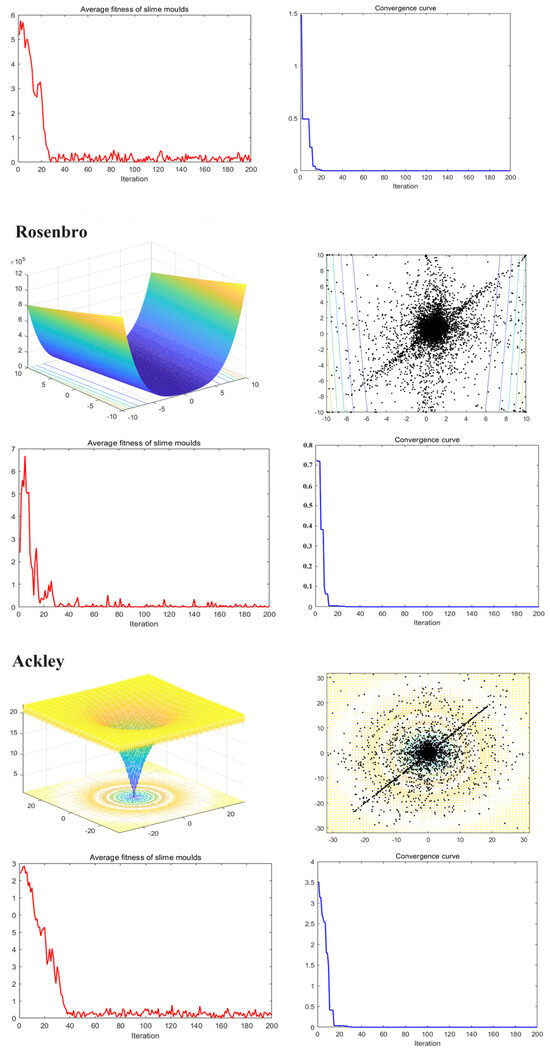Figure 3 shows the qualitative analysis results of MFSMA in the processing of unimodal and multimodal functions (Sphere, Griewank, Rastrigin, Ackley, Rosenbrock), and visualizes the changes in the position and fitness value of the optimized slime mould during the foraging process. This graph consists of three indicators: search history, slime mould average fitness value, and iteration convergence curve. In this part, we set the maximum number of iterations of MFSMA to 200 and the population size to 50.