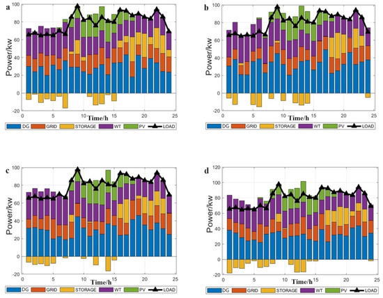 This paper simulated the optimal dispatch of different types of DGs in the micro-grid, using the four models given in Table 3, DG1-4 correspond to a-d in the figure respectively. It can be seen from Figure 5 that both wind power generation and photovoltaic power generation are unstable. The output power of wind power generation is mainly affected by the real-time wind speed, while photovoltaic power generation is greatly affected by solar radiation and temperature. Photovoltaic generators produce little electricity during periods of low solar radiation. We use MFSMA to optimize the dispatch of the economic model of the microgrid. This paper uses a variety of electrical constraints to meet the load of 24 h a day. By controlling the active power output of the DGs that can control the operating cost and environmental governance cost of the microgrid, we reduce the total cost and complete the economy of the microgrid.